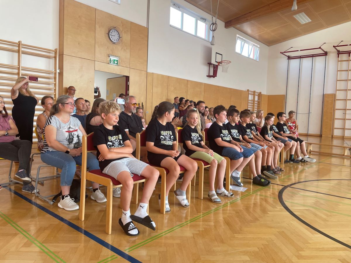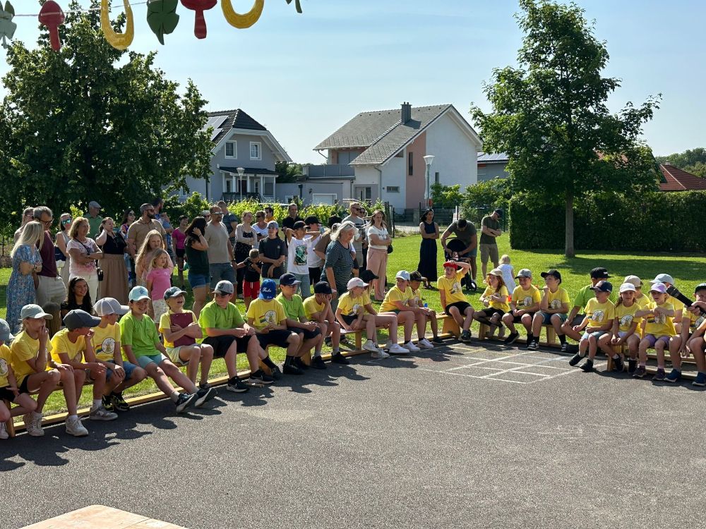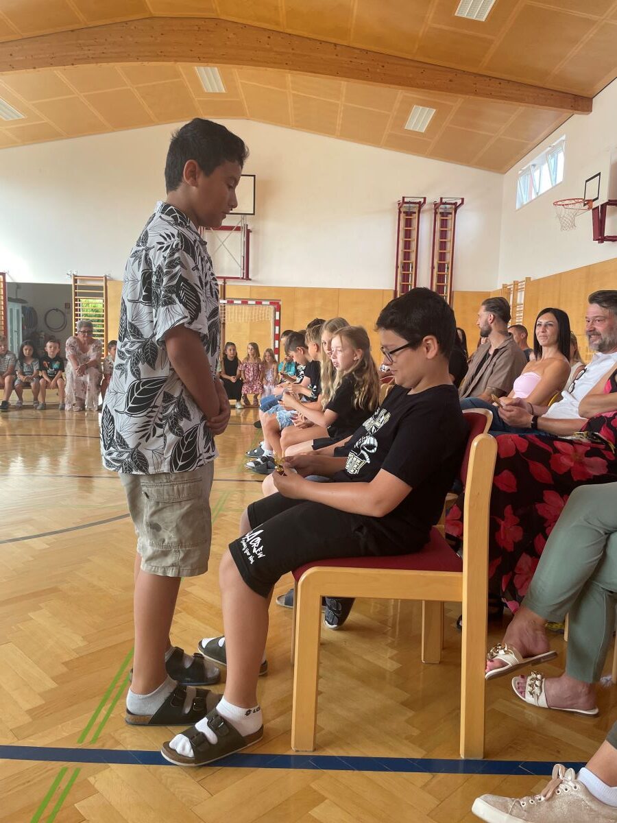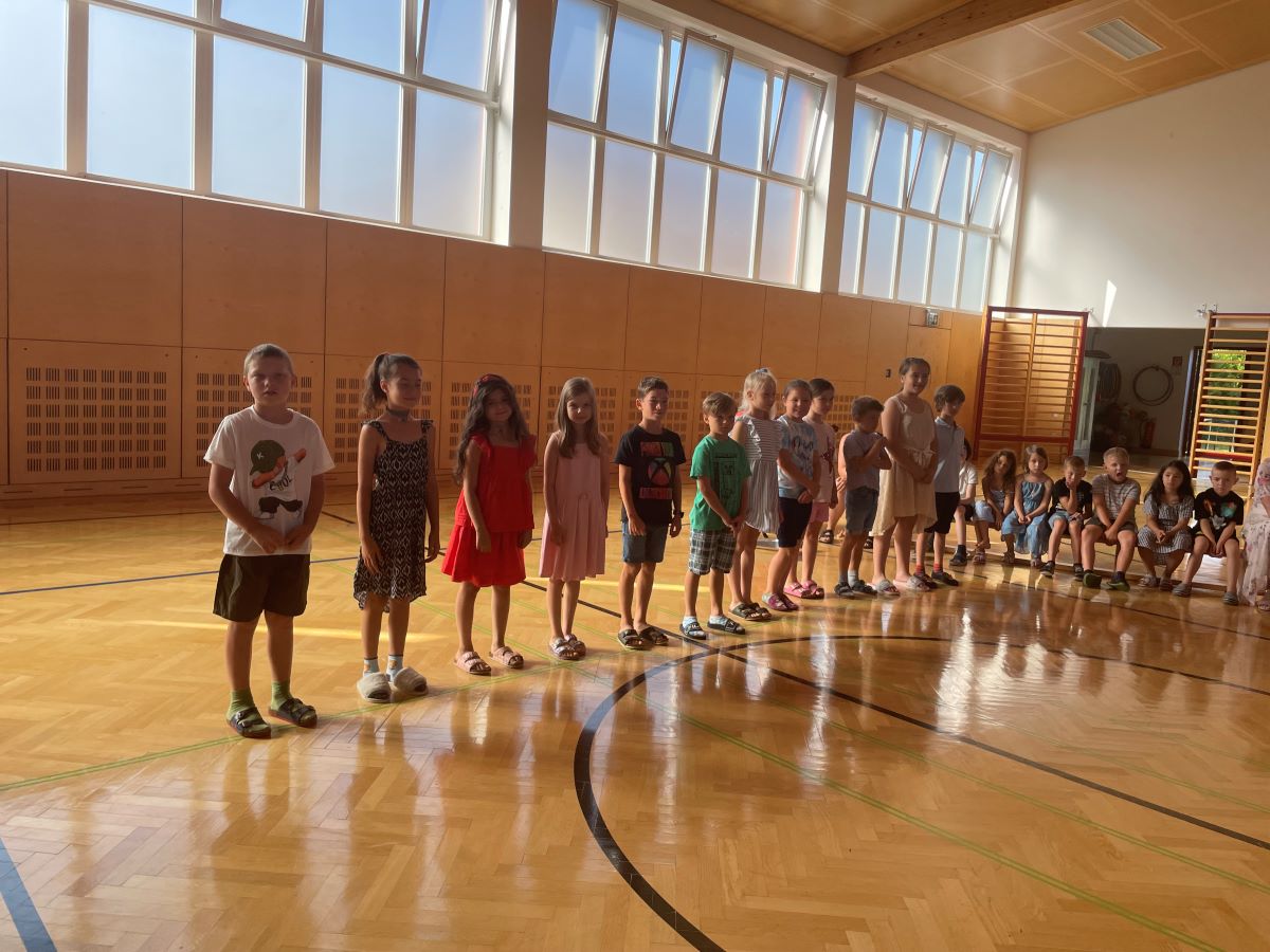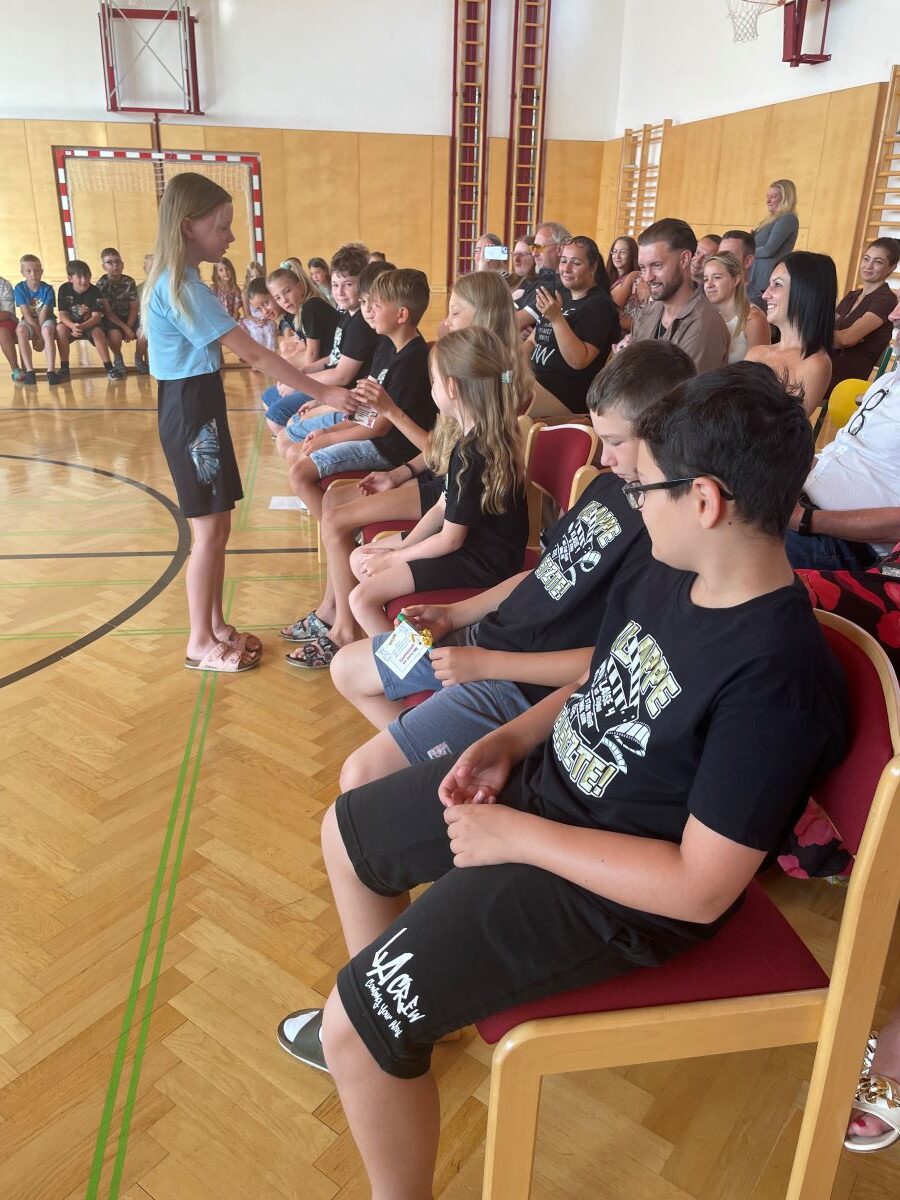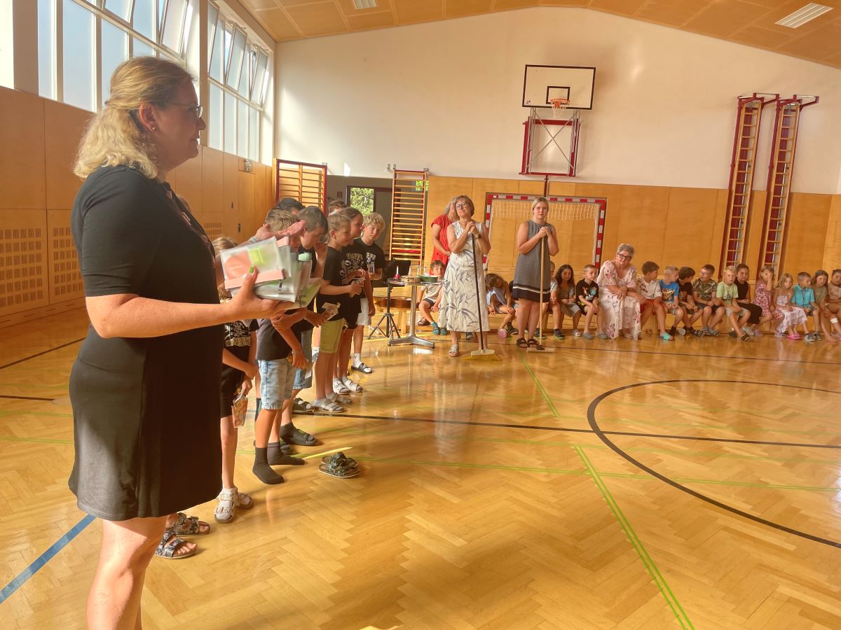Wie an jedem letzten Schultag eines Schuljahres mussten wir uns auch heuer von einer 4. Klasse verabschieden. Es kamen viele Eltern und Großeltern zu dieser Feier im Turnsaal der Volksschule. Die 10 Schüler/innen der Abschlussklasse von Fr. Mayer nahmen auf den Ehrensesseln in der ersten Reihe Platz. Nach den Eröffnungsworten unserer Schulleiterin richtete die 2. Klasse das Wort an die Großen, die uns nun verlassen. Anschließend sangen alle Kinder der 1. bis 3. Klasse ein passendes Lied und die 3. Klasse überreichte jedem scheidenden Viertklässler ein kleines Geschenk mit persönlichen Worten. Auch die Abschlussklasse wollte etwas zur Feier beitragen. Sie berichteten von besonderen Aktivitäten im letzten Schuljahr – dem Schokolade-Projekt, dem Ausflug in den Kletterpark und von der Zeltnacht in der vorletzten Schulwoche. Bevor die 10 Buben und Mädchen dann traditionell aus der Schule gekehrt wurden, erhielten sie mit netten Worten noch Geschenke von der Gemeindevertretung und dem Elternverein. Schön, dass Frau Bürgermeister Lassinger, Frau Amtsrätin Ofner und Frau Simmel, die Obfrau des Elternvereins, mit uns gefeiert haben!