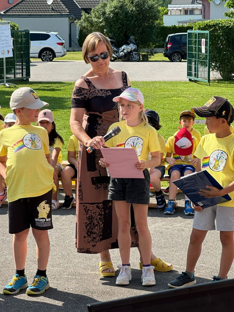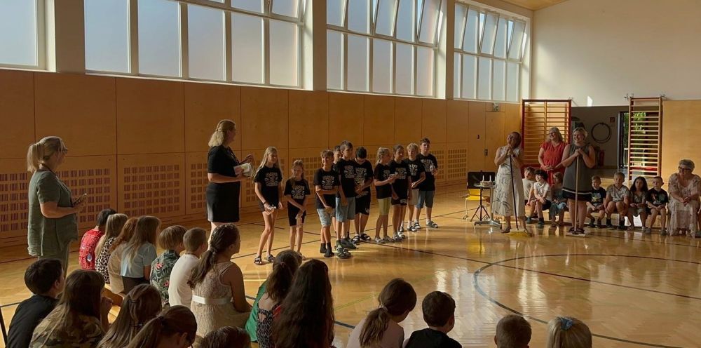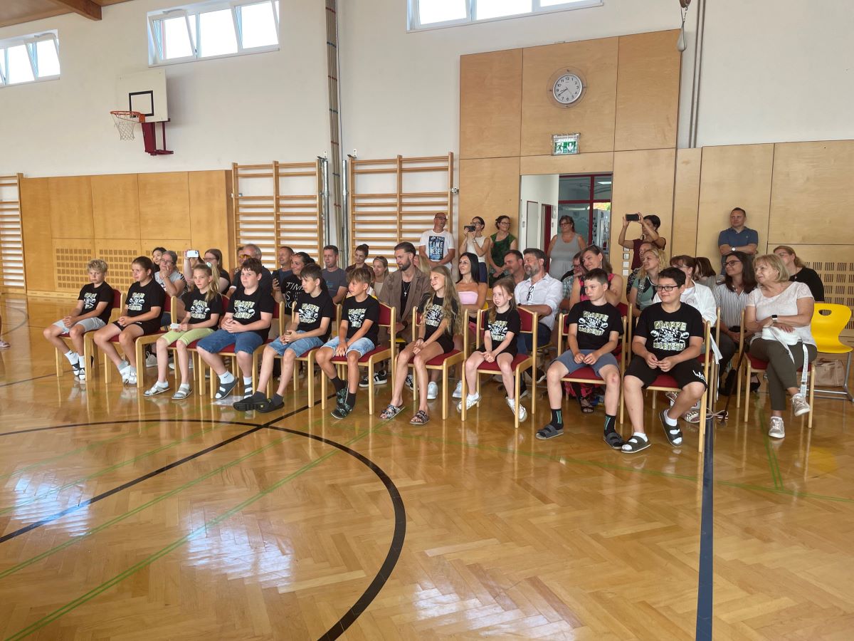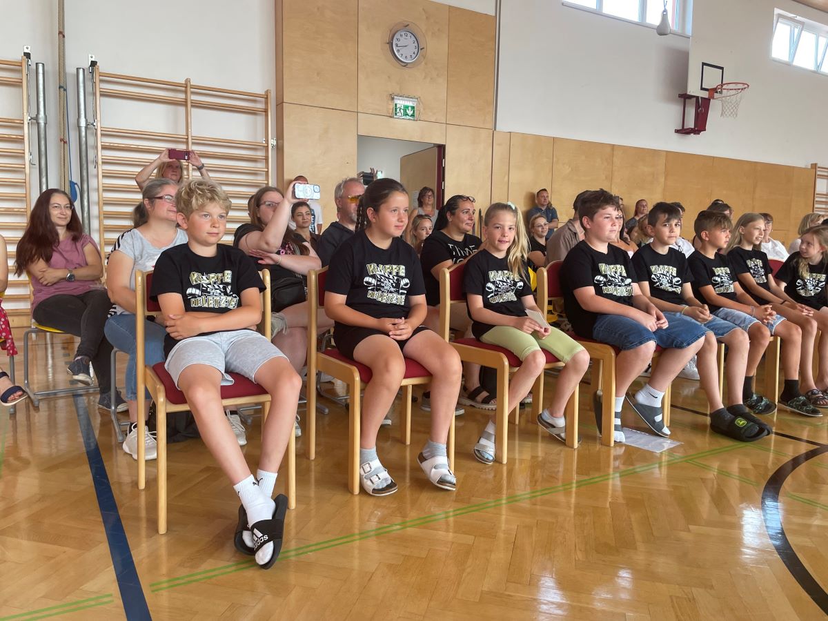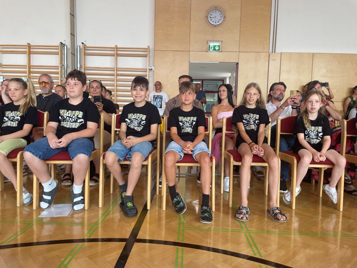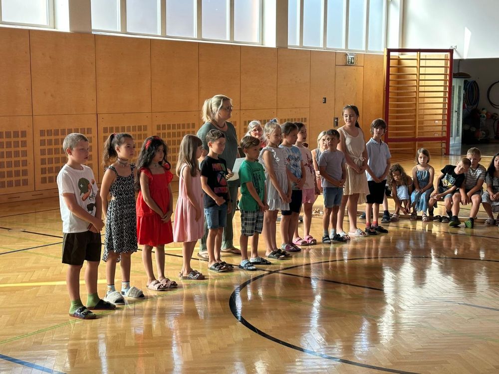 Wie an jedem letzten Schultag eines Schuljahres mussten wir uns auch heuer von einer 4. Klasse verabschieden. Es kamen viele Eltern und Großeltern zu dieser Feier im Turnsaal der Volksschule. Die 10 Schüler/innen der Abschlussklasse von Fr. Mayer nahmen auf den Ehrensesseln in der ersten Reihe Platz. Nach den Eröffnungsworten unserer Schulleiterin richtete die 2. Klasse das Wort an die Großen, die uns nun verlassen. Anschließend sangen alle Kinder der 1. bis 3. Klasse ein passendes Lied und die 3. Klasse überreichte jedem scheidenden Viertklässler ein kleines Geschenk mit persönlichen Worten. Auch die Abschlussklasse wollte etwas zur Feier beitragen. Sie berichteten von besonderen Aktivitäten im letzten Schuljahr – dem Schokolade-Projekt, dem Ausflug in den Kletterpark und von der Zeltnacht in der vorletzten Schulwoche. Bevor die 10 Buben und Mädchen dann traditionell aus der Schule gekehrt wurden, erhielten sie mit netten Worten noch Geschenke von der Gemeindevertretung und dem Elternverein. Schön, dass Frau Bürgermeister Lassinger, Frau Amtsrätin Ofner und Frau Simmel, die Obfrau des Elternvereins, mit uns gefeiert haben!