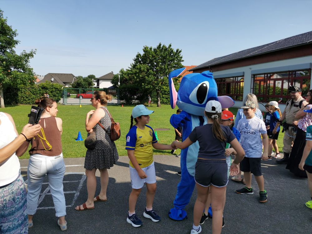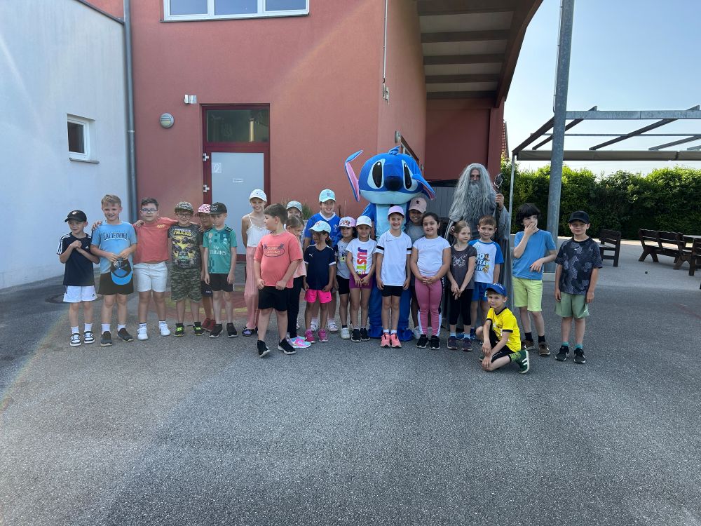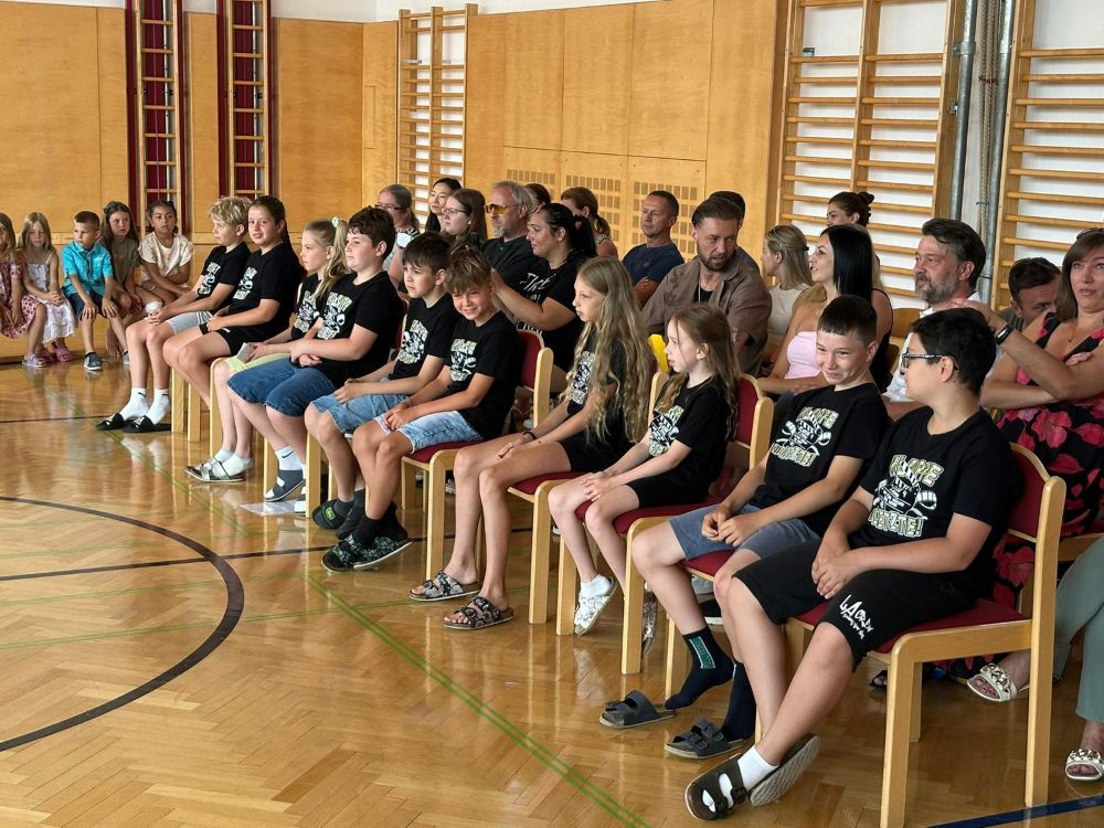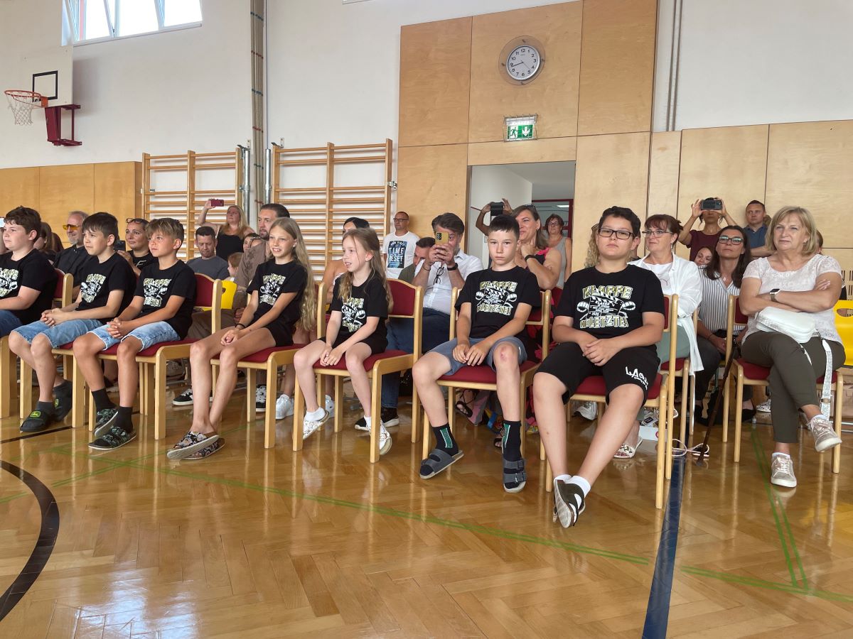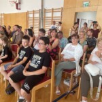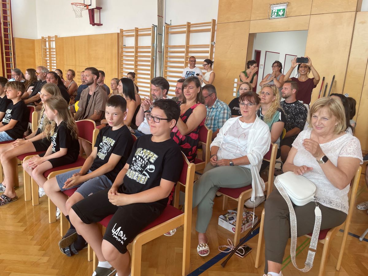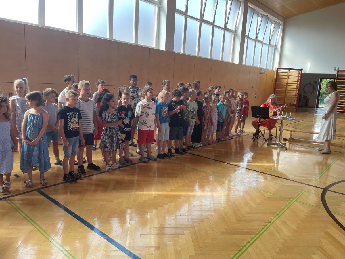 Wie an jedem letzten Schultag eines Schuljahres mussten wir uns auch heuer von einer 4. Klasse verabschieden. Es kamen viele Eltern und Großeltern zu dieser Feier im Turnsaal der Volksschule. Die 10 Schüler/innen der Abschlussklasse von Fr. Mayer nahmen auf den Ehrensesseln in der ersten Reihe Platz. Nach den Eröffnungsworten unserer Schulleiterin richtete die 2. Klasse das Wort an die Großen, die uns nun verlassen. Anschließend sangen alle Kinder der 1. bis 3. Klasse ein passendes Lied und die 3. Klasse überreichte jedem scheidenden Viertklässler ein kleines Geschenk mit persönlichen Worten. Auch die Abschlussklasse wollte etwas zur Feier beitragen. Sie berichteten von besonderen Aktivitäten im letzten Schuljahr – dem Schokolade-Projekt, dem Ausflug in den Kletterpark und von der Zeltnacht in der vorletzten Schulwoche. Bevor die 10 Buben und Mädchen dann traditionell aus der Schule gekehrt wurden, erhielten sie mit netten Worten noch Geschenke von der Gemeindevertretung und dem Elternverein. Schön, dass Frau Bürgermeister Lassinger, Frau Amtsrätin Ofner und Frau Simmel, die Obfrau des Elternvereins, mit uns gefeiert haben!