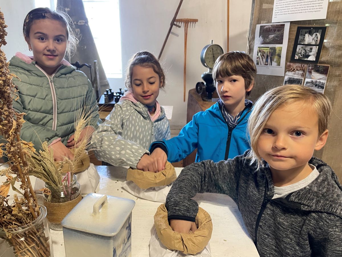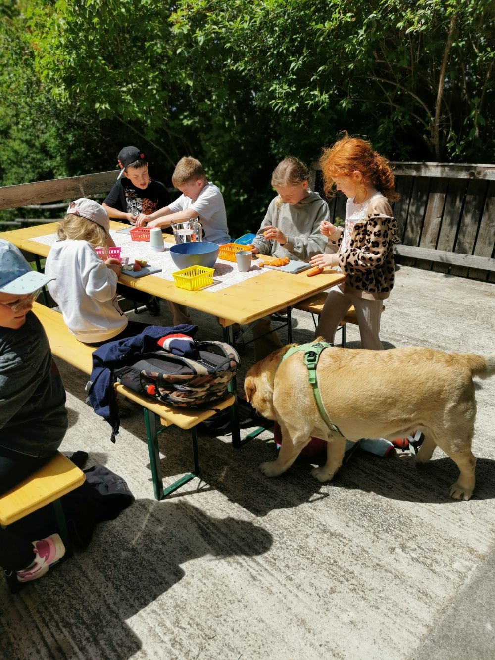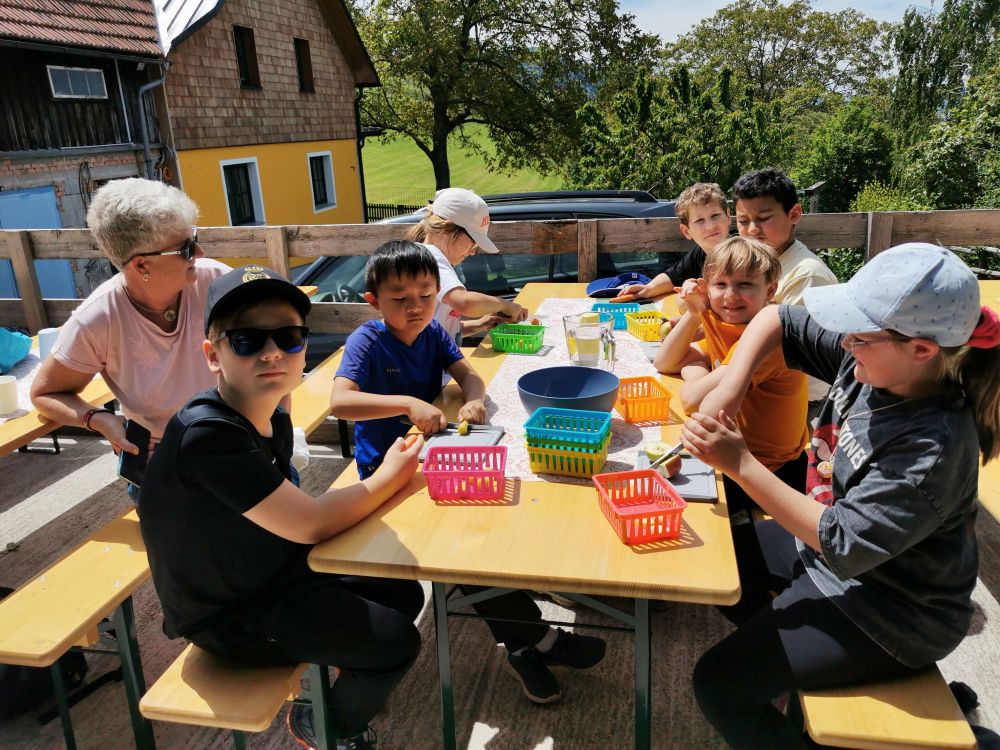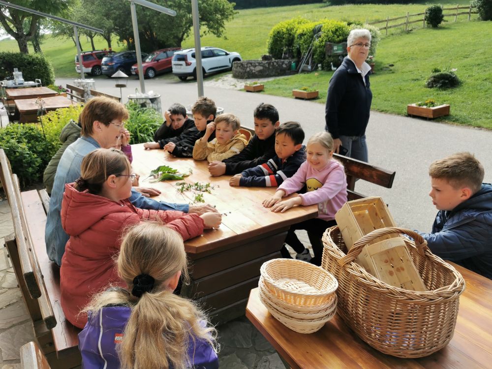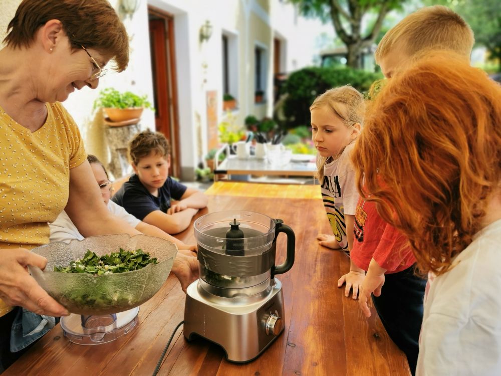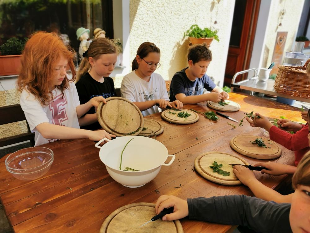 Mit viel Engagement beteiligten sich die Kinder auch an der Kräuterwerkstatt mit Erna. Die Kräuter wurden selbst gepflückt und dann zu einem Aufstrich und Kräutersalz verarbeitet.