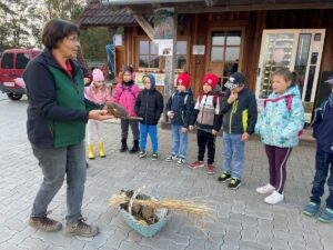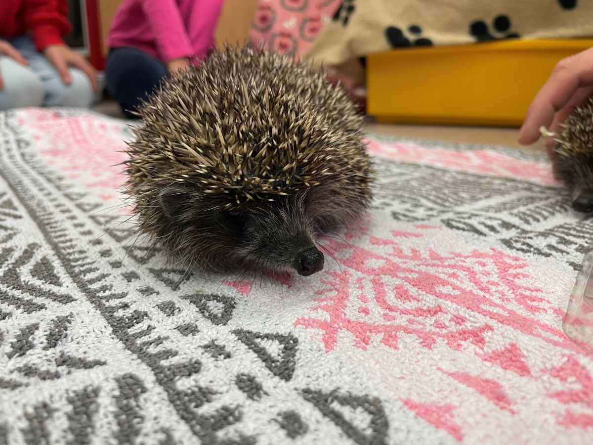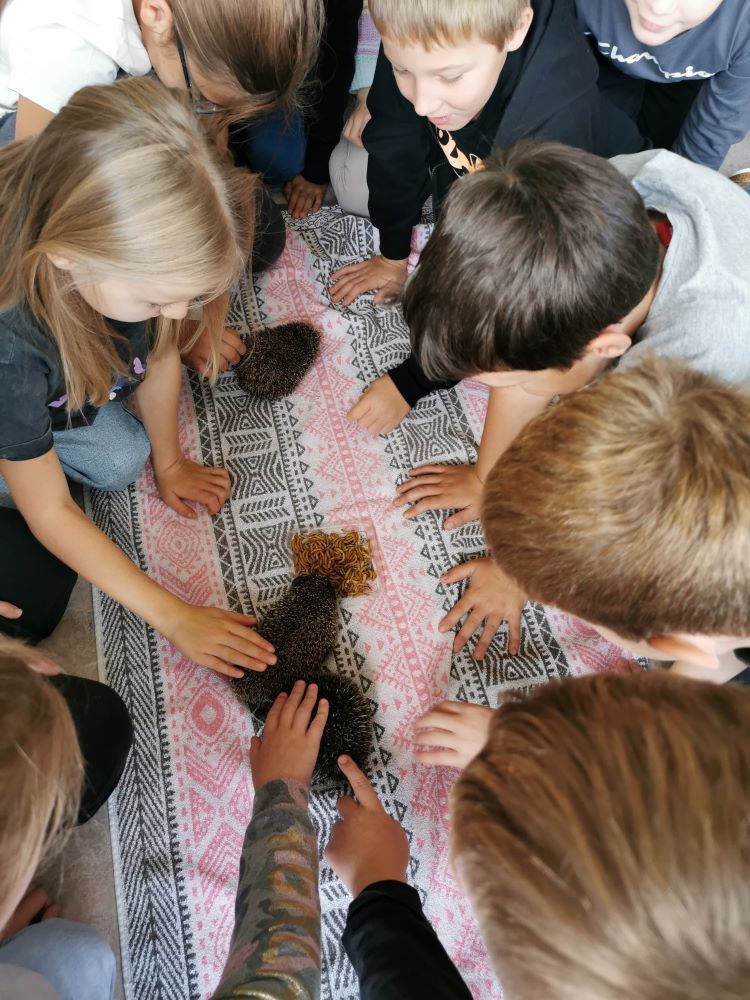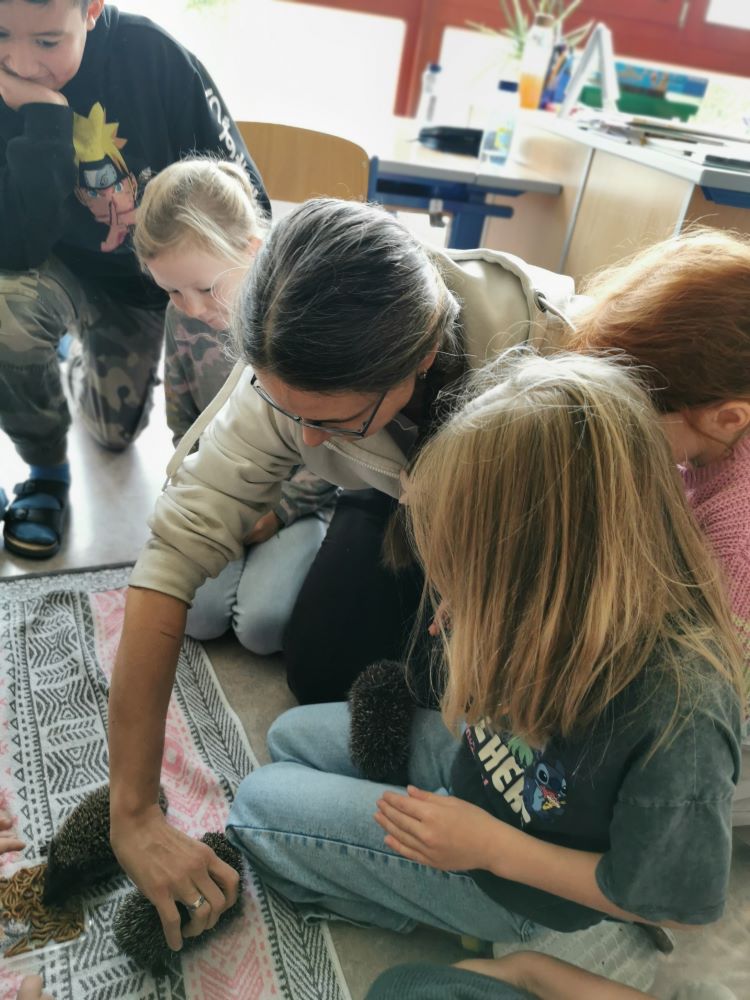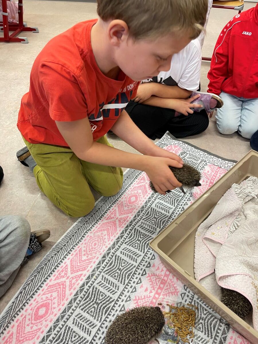 Carina knüpfte an das Wissen der Kinder an und ergänzte dieses mit ihren Erfahrungsberichten und der Beantwortung aller Fragen zum Thema. Die Kinder durften die Igel auch beobachten, erleben, wie sie sich zu einer Kugel einrollen und die kleinen Tiere ganz vorsichtig berühren.