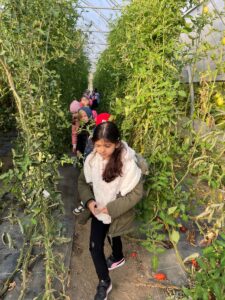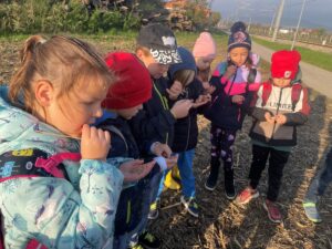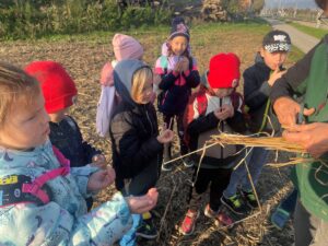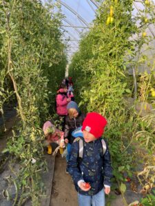 Am letzten Tag vor den Herbstferien trafen die Kinder der 2. Klasse ihre Lehrerinnen beim Bio-Hofladen der Familie Osterer in Tribuswinkel. Frau Osterer begrüßte alle und erklärte die Begriffe „Hofladen“ und „Bio-Landwirtschaft“. Beim anschließenden Spaziergang durften die Kinder die vielen Geräte in der Scheune, sowie das geerntete Gemüse im Kühlhaus, sehen. Am Acker lernten die Buben und Mädchen viel über Getreide und darüber, was daraus gemacht wird. Jedes Kind erhielt eine Weizenähre und durfte selbst Körner dreschen und diese kosten. Frau Osterer war es hier auch besonders wichtig, dass die Schüler/innen den Unterschied von Stroh und Heu kennen und auch erklären können. Vom Feld ging es weiter in die Folien-Tunnel. Hier konnten sogar noch Paprika, Karotten und Schnittlauch für die Jause am Hof geerntet werden.