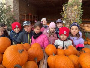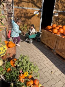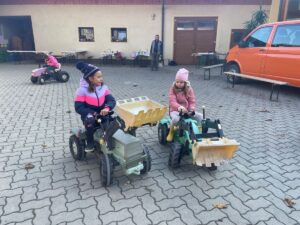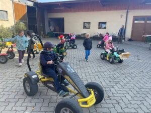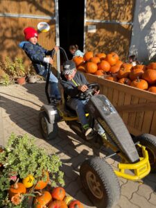 Besonderen Spaß hatten die Kinder am Schluss im Innenhof mit den Tret-Traktoren und anderen Fahrzeugen. Als die Schüler/innen von ihren Eltern abgeholt wurden, wurden noch Kürbisse ausgesucht, gekauft und zum Schnitzen und Verkochen mit nach Hause genommen.