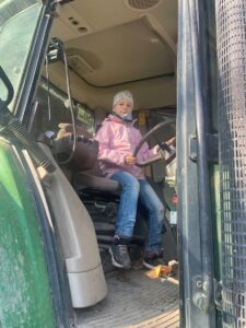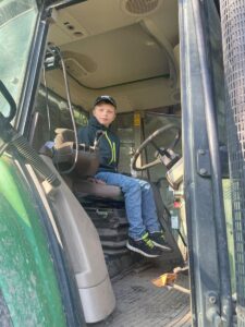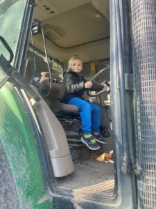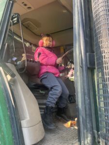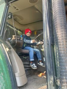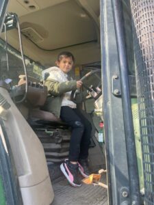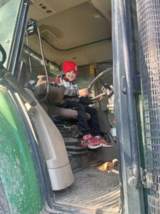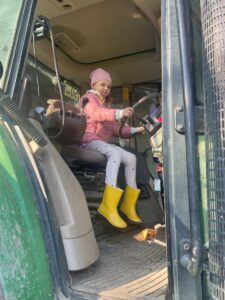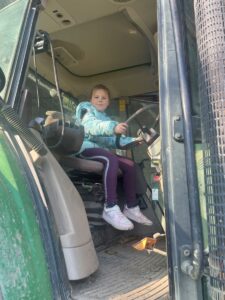 Nach einer Stärkung am Bauernhof durften die Mädchen und Buben die Hasen im Stall und die Hühner im Garten besuchen. Es gab auch ein Tast-Spiel rund ums Huhn. Jedes Kind kletterte in den großen Traktor und nahm für ein Foto hinter dem Lenkrad Platz. Das war recht hoch, doch für die „Kletteräffchen“ der 2. Klasse selbstverständlich kein Problem.
