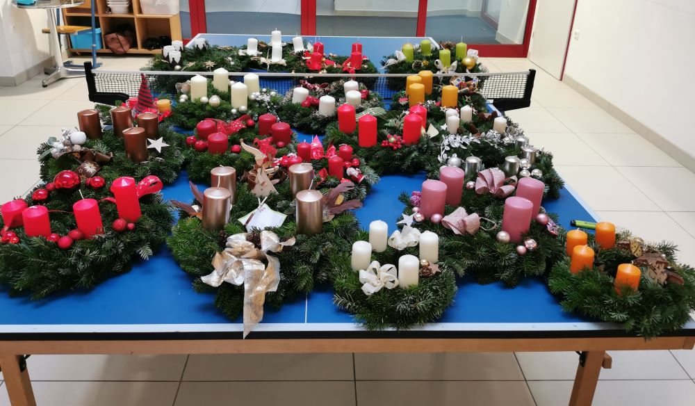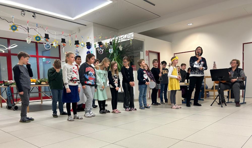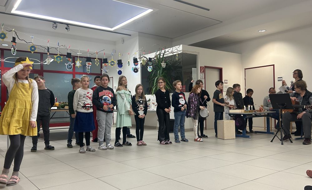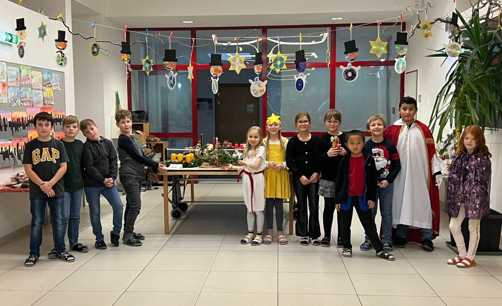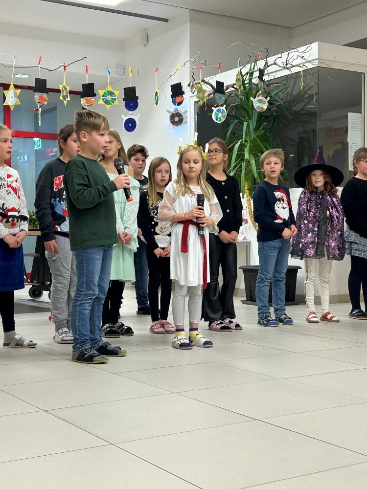 Am 29.11. fand der mittlerweile zur Tradition gewordene Adventmarkt bei uns in der Schule statt. Die 3. Klasse als Veranstalter hat sich lange darauf vorbereitet, im Unterricht wurde vielerlei gebastelt und Kekse gebacken, an 2 Nachmittagen stellten Eltern mit den Kindern gemeinsam in der Schule ebenfalls viele schöne Sachen her. Wie auch schon in den Jahren davor dekorierten unsere freiwilligen Helferinnen Andrea Dentinger und Marianne Peska mit großer Leidenschaft Adventkränze und Gestecke. Zur Eröffnung des Marktes präsentierten die Kinder die musikalische Reise eines kleinen Engels, der sich auf die Suche nach Advent- und Weihnachtsbräuchen in verschiedenen Ländern machte.