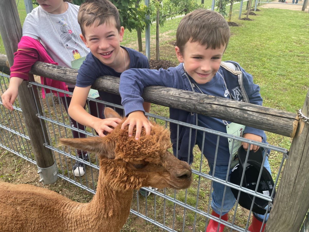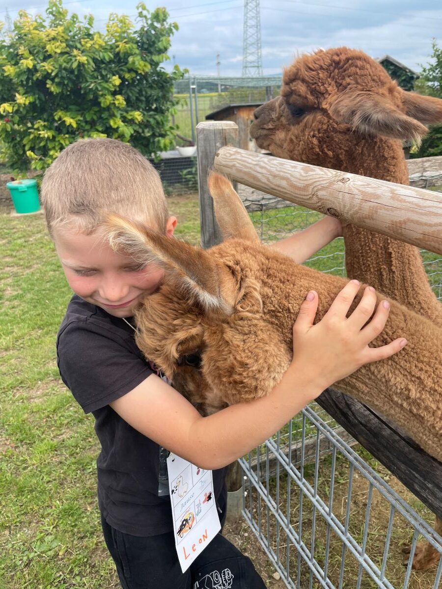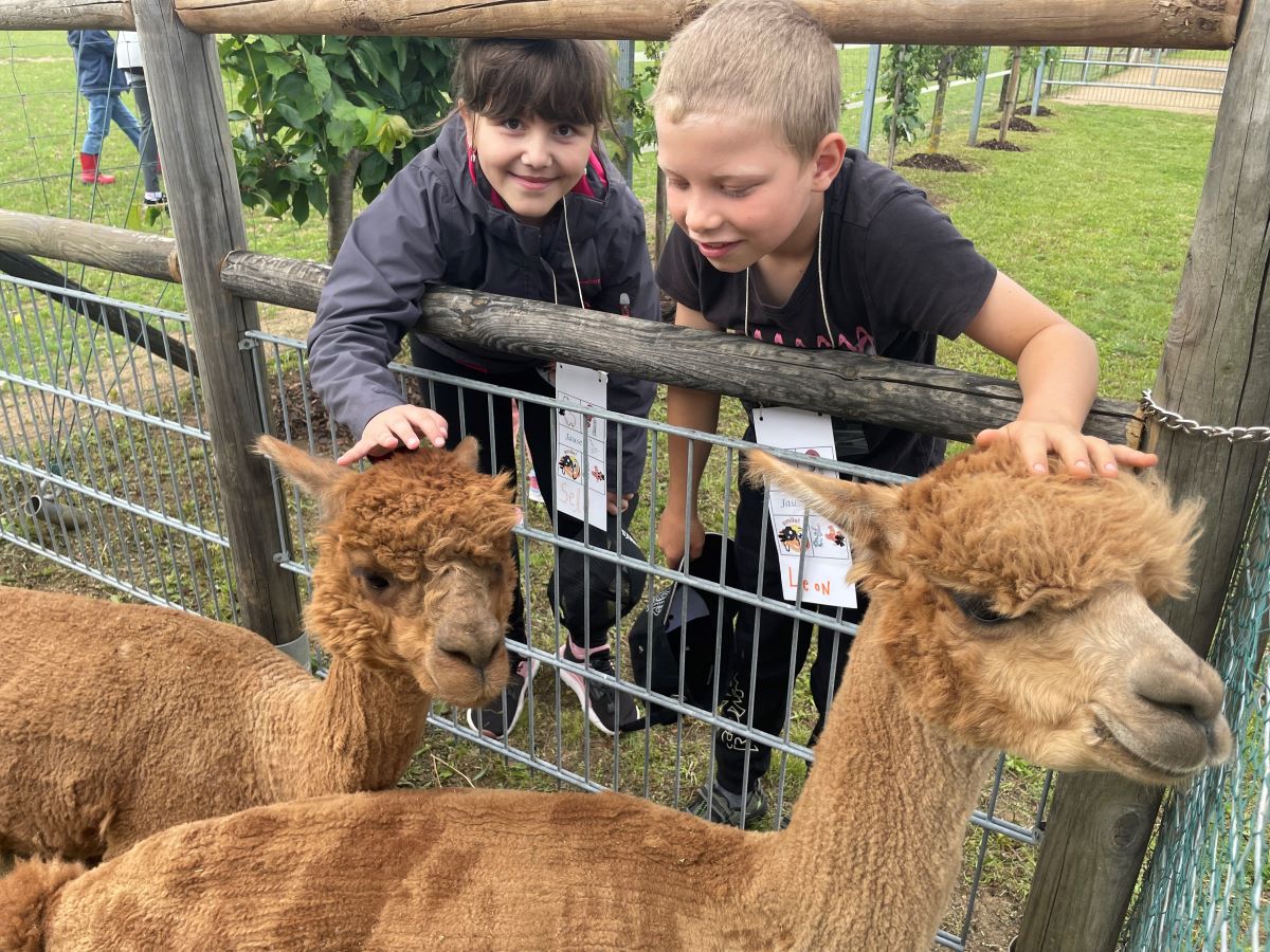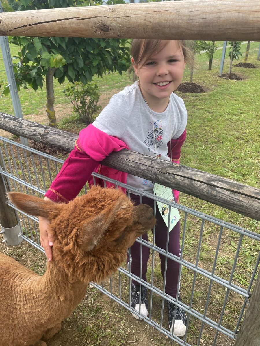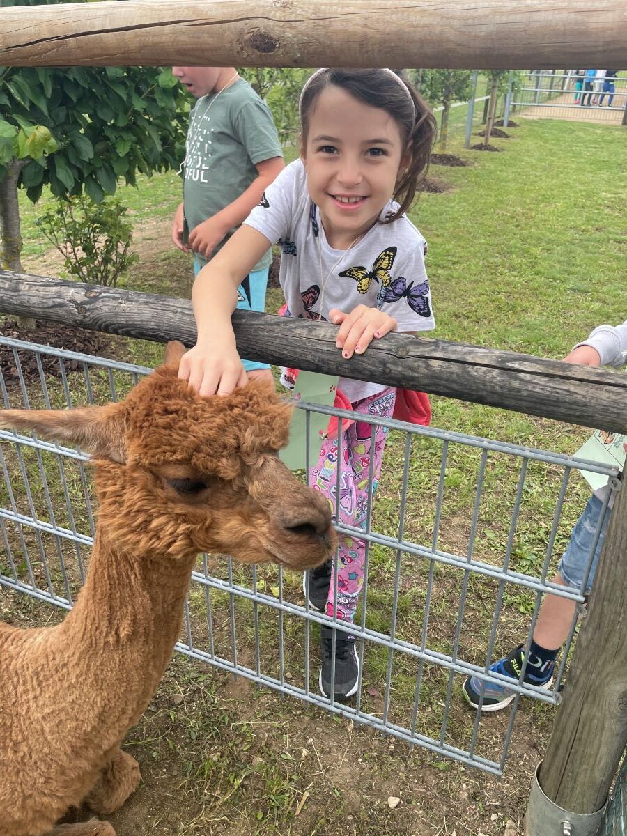 Die 1. Klasse folgte am Hexenweg den bunten Steinen und durfte sich nicht in die Irre führen lassen. Die rote Schlange musste rutschend erkundet werden, dem alten Weiblein musste über das Spinnennetz entkommen werden und es musste geschätzt werden, auf welcher Höhe die Hexe mit ihrem Hexenbesen am Baum hängengeblieben war. Dann konnten selbst Hexenbesen getestet werden, um anschließend beim Hexenbesen-Wettrennen gewinnen zu können. Auch Hänsel und Gretel statteten die Erstklässler einen Besuch ab. Nach einer sonnigen Jausenpause ging es über die Wildgehege zurück zum Streichelzoo und zum Abenteuer-Spielplatz.