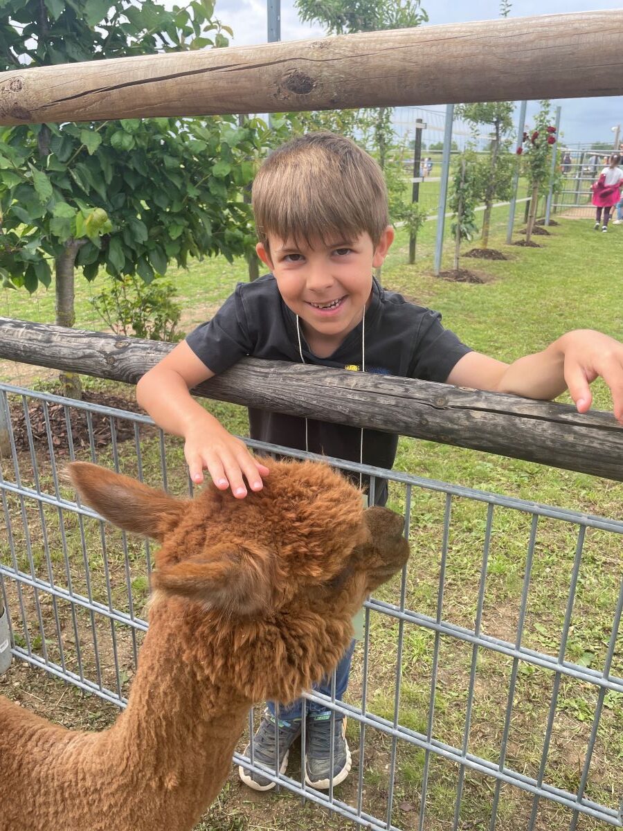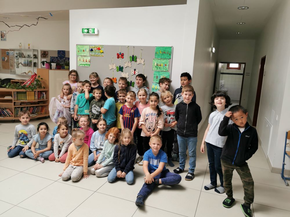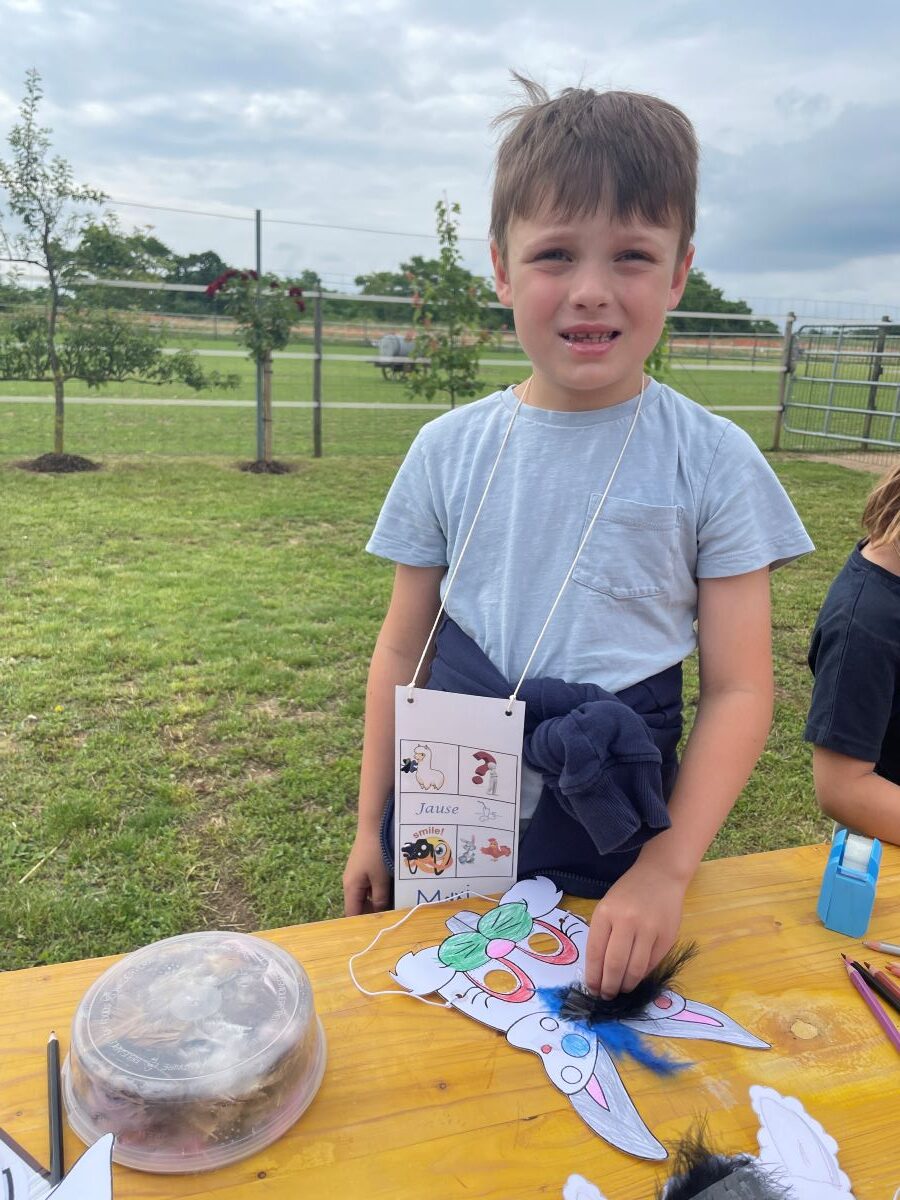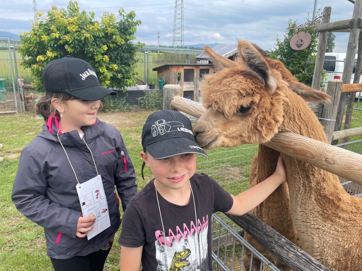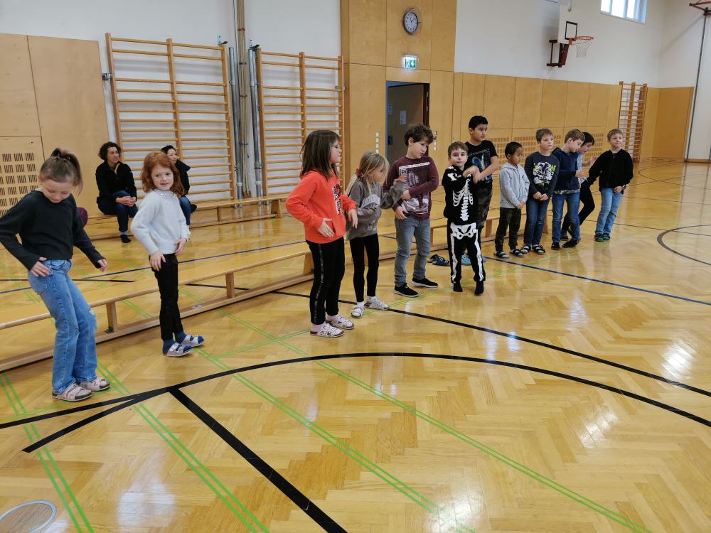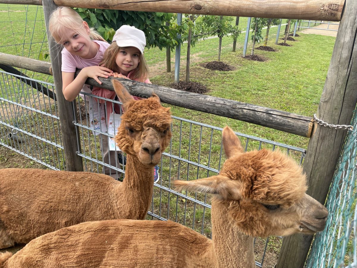 Die 1. Klasse folgte am Hexenweg den bunten Steinen und durfte sich nicht in die Irre führen lassen. Die rote Schlange musste rutschend erkundet werden, dem alten Weiblein musste über das Spinnennetz entkommen werden und es musste geschätzt werden, auf welcher Höhe die Hexe mit ihrem Hexenbesen am Baum hängengeblieben war. Dann konnten selbst Hexenbesen getestet werden, um anschließend beim Hexenbesen-Wettrennen gewinnen zu können. Auch Hänsel und Gretel statteten die Erstklässler einen Besuch ab. Nach einer sonnigen Jausenpause ging es über die Wildgehege zurück zum Streichelzoo und zum Abenteuer-Spielplatz.